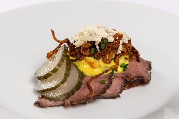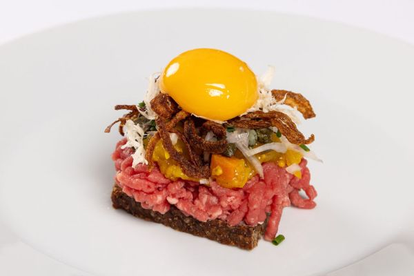 Pickles, rå løg, stegte løg, kapers, peberrod og æggeblomme.