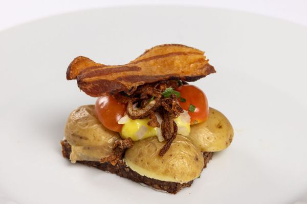 (NY OPSKRIFT) Karrymayonnaise, tomat, rå løg, stegte løg og sprødstegt bacon.