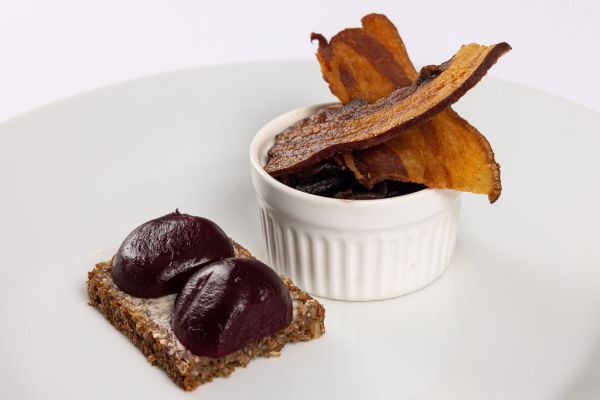 Smørstegte svampe, sprødstegt bacon og syltede rødbeder.