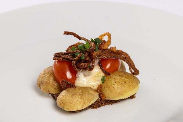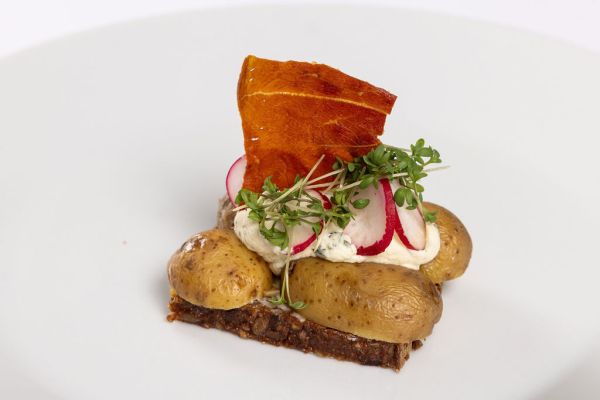Røget kartoffel, fed cremefraiche med persille og radiser samt sprødstegt lufttørret skinke.