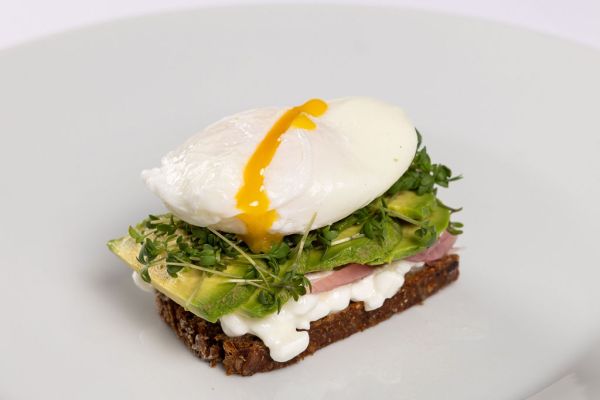 Avocado, pocheret æg og hytteost.
